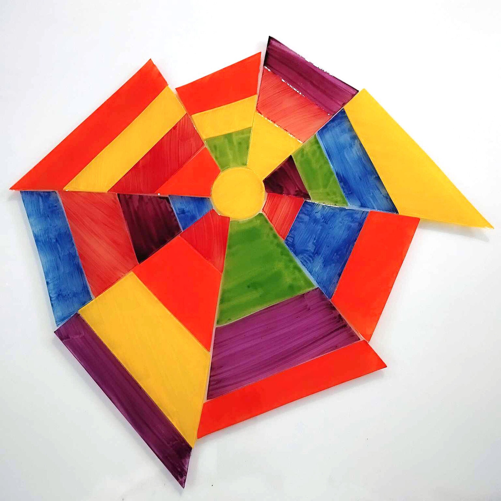 “Disco”, 2024, emalia fusingowa na szkle, mozaika szklana Do jej wykonania zainspirowały mnie światło, ale również swoboda i odwaga w doborze kolorów, którą dostrzegłam w stylistyce plakatów z lat siedemdziesiątych.